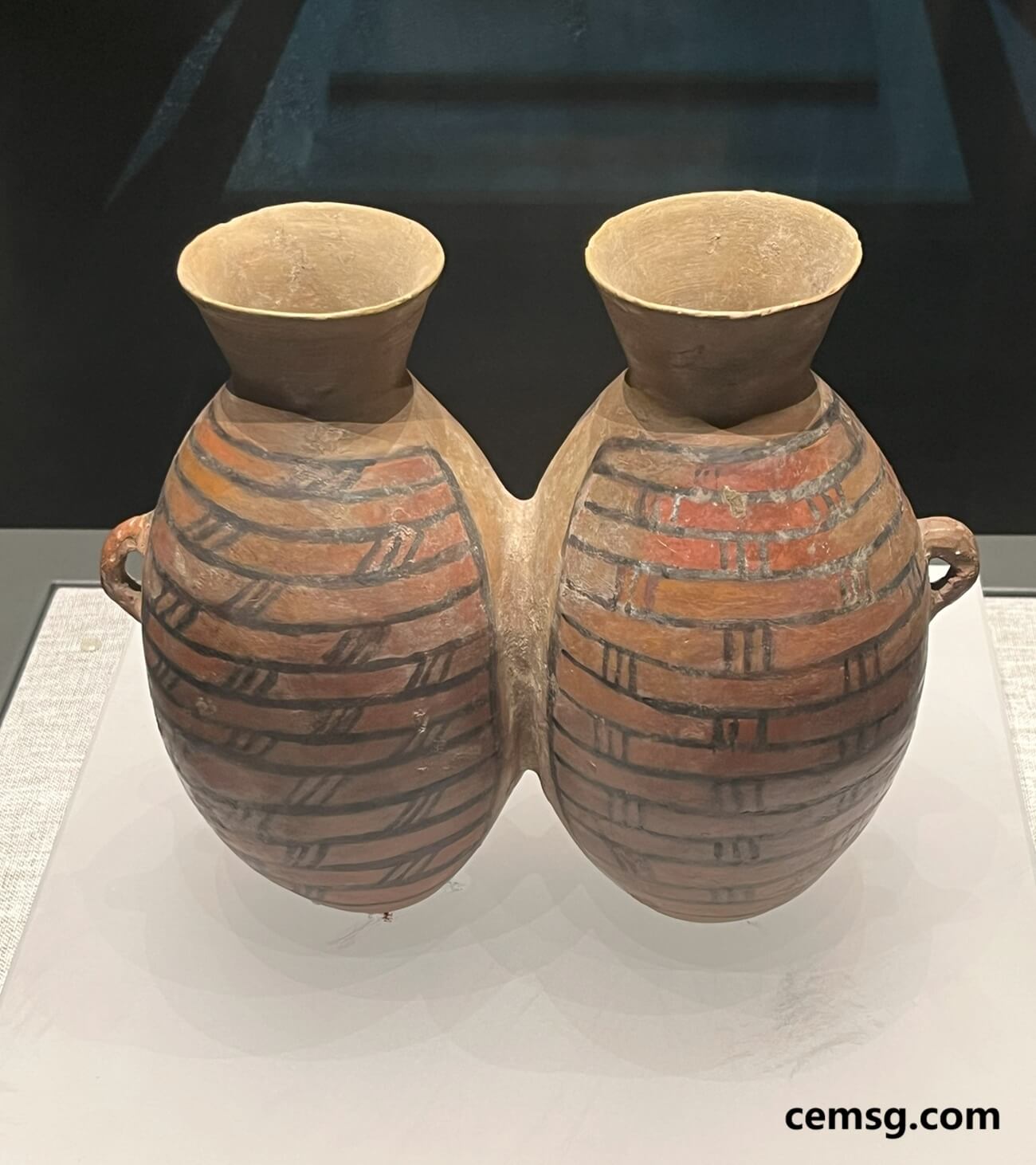 These red-coated black-painted twin flasks are joined and interlinked at their bellies through a cubic opening. Drinking vessels of this design are still in use now in some ethnic groups, Each of two people drinks from one of the twin flasks to show their friendliness, union and love.