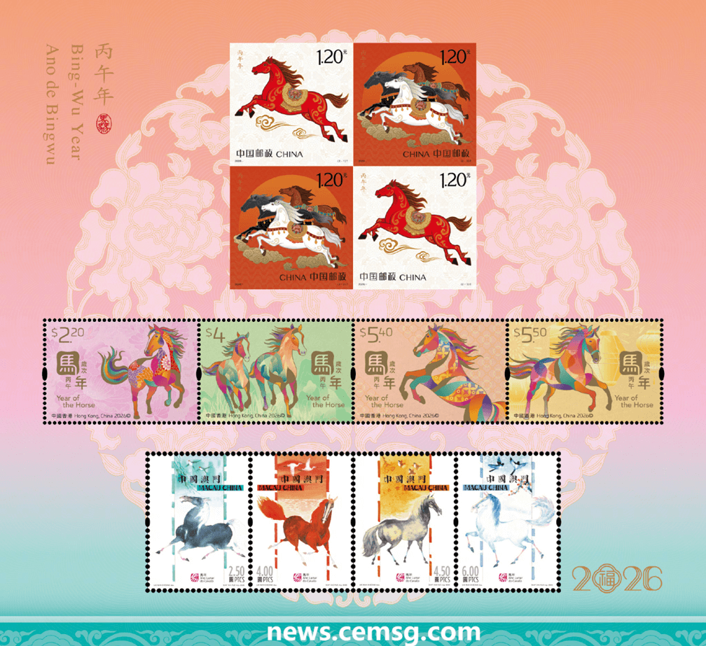 Year of the Horse Zodiac Stamps Officially Issued in China Date: 2026-01-05 Category: Culture The 2026 Bingwu Year Special Stamps were officially issued today. The design of the complete stamp set features dynamic lines and depicts the horse in a spirited and majestic posture.